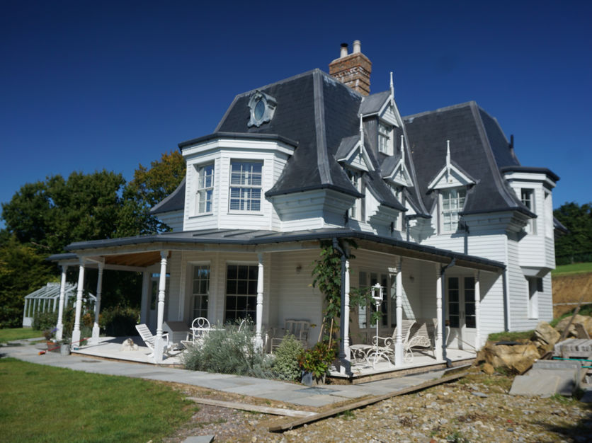 This house was designed with a sense of fun and the repatriation of the style of the second empire, American gothic as it were. With porches, glazed loggias, gables and multiple tiers of dormers, the use of weatherboard and timber detailing is pushed to the limits. The steep mansard roof is highlighted with an ‘oeil de boeuf‘ window and topped with a tower. The long kitchen is reached via a fully glazed hall. The house is full of light flooding in through large sash windows that benefit from the hill top position.