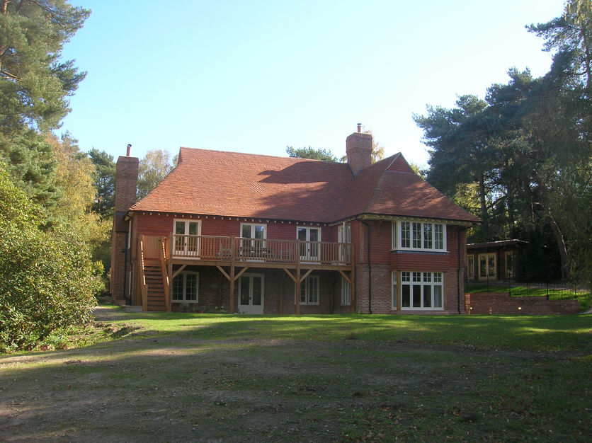 This woodland setting has long views of Bewl Water so the cottage is designed with the living accommodation at first floor level; but due to the slope of the site, the front door is on the first floor. The kitchen and living rooms have vaulted ceilings and access to a large balcony forming a loggia over the bedrooms. The bedrooms, bathrooms and utilities are on the lower floor with direct garden access. What appears to be a pavilion in the woods is in fact something quite different!